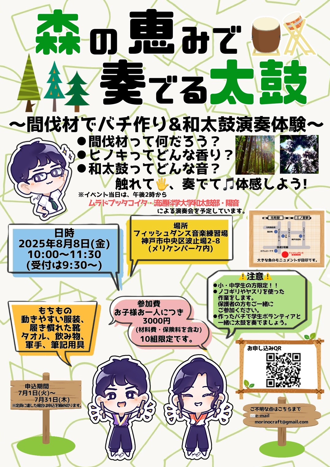 ノコギリやヤスリを使って、間伐材から“自分だけのバチ”をつくり、 学生ボランティアや地元の演奏者と一緒に、音を合わせる演奏体験を行います。 自然に触れながら、仲間と音をつくる——そんな夏のひとときを親子で過ごしてみませんか?
